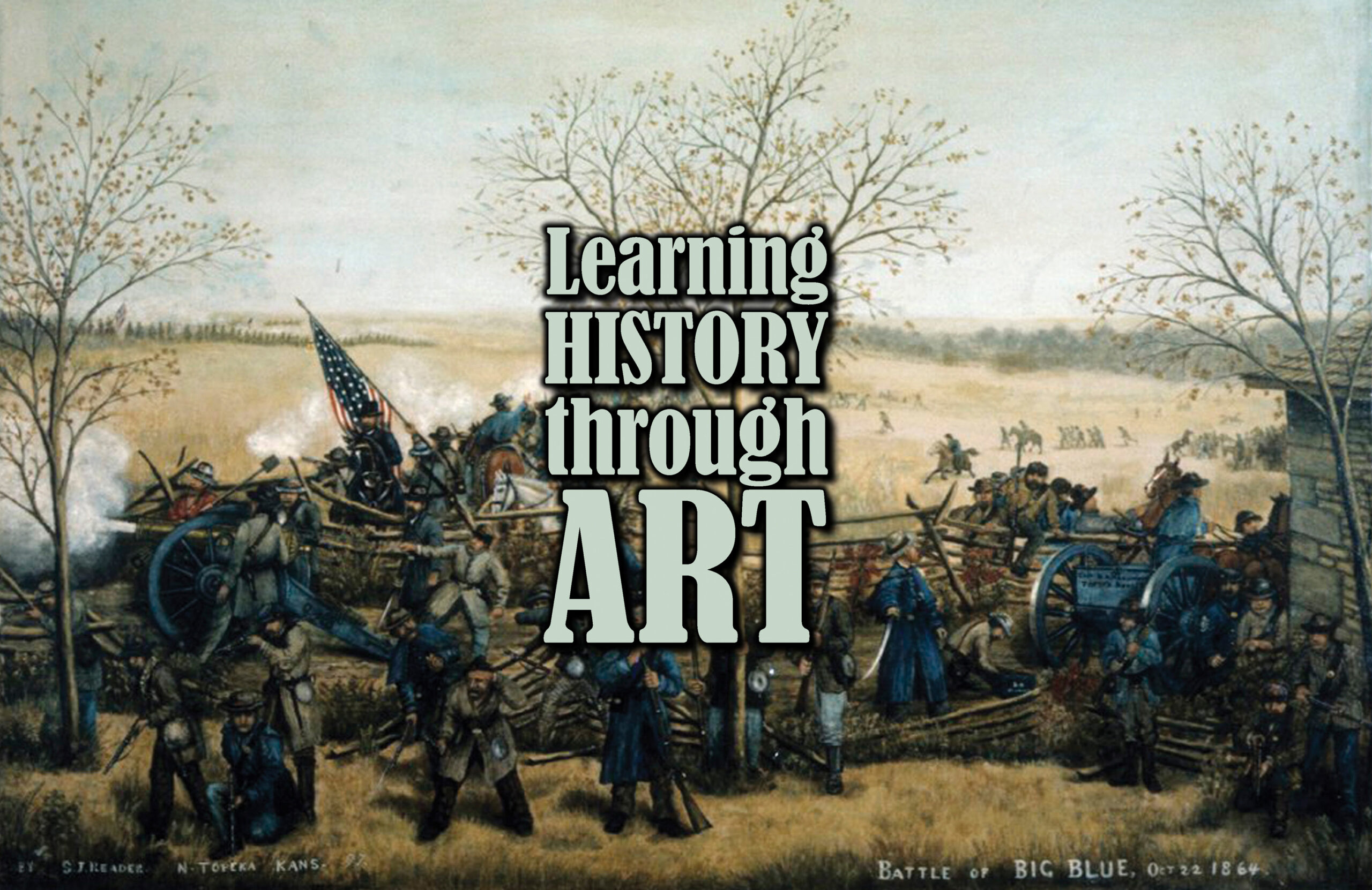 It was eight years later that Reader was involved in action during the Civil War. He fought for the Union as part of the Second Kansas State Militia, whose members were almost all from Shawnee County. Reader served as an officer in the “field and staff” of the militia, with the rank of First Lieutenant, Assistant Quartermaster. Price’s Raid, also known as Price’s Missouri Expedition, was a Confederate raid through Missouri and Kansas in the Trans-Mississippi Theater of the Civil War in the fall of 1864. During the raid, Reader participated in the Battle of the Big Blue on Oct. 22, 1864. His dramatic painting of the Battle of the Big Blue shows Union infantry forces in brown and blue coats lining wooden fences. The Confederate forces are shown in the distance on the left side of the image. On Oct. 25, 1864, Reader’s painting of the Battle of Mine Creek, titled “It Went Against Us,” offers great detail of the event. The Battle of Mine Creek was one of the largest cavalry engagements of the Civil War and contributed to a Confederate retreat. It was one of the last major confrontations on the western front.