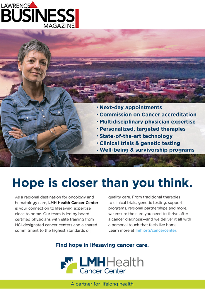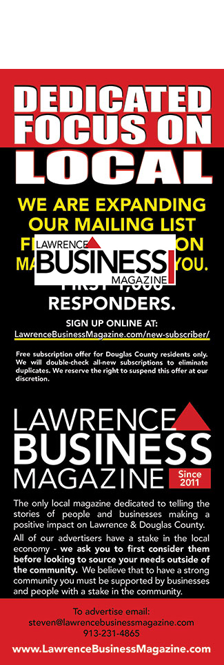 The Lawrence Business Magazine is the only local magazine dedicated to telling the stories of people and businesses making a positive impact on Lawrence & Douglas County, advocating for those businesses and people while only accepting advertisers with a stake in the local economy. We believe that to have a strong community you must be supported by businesses and people with a stake in our community.